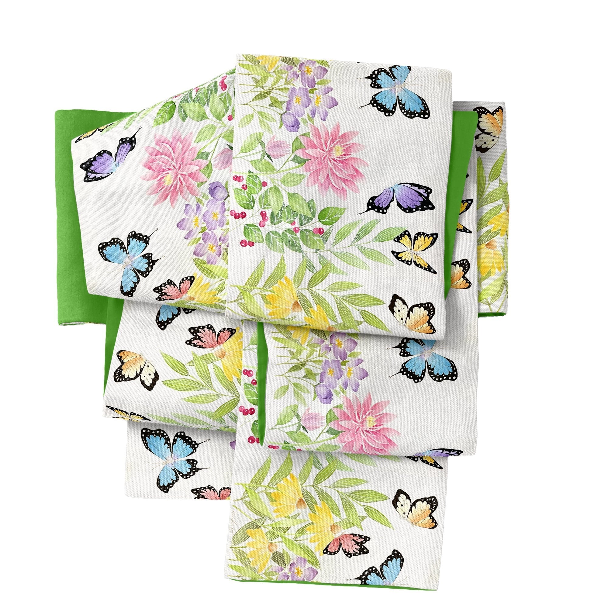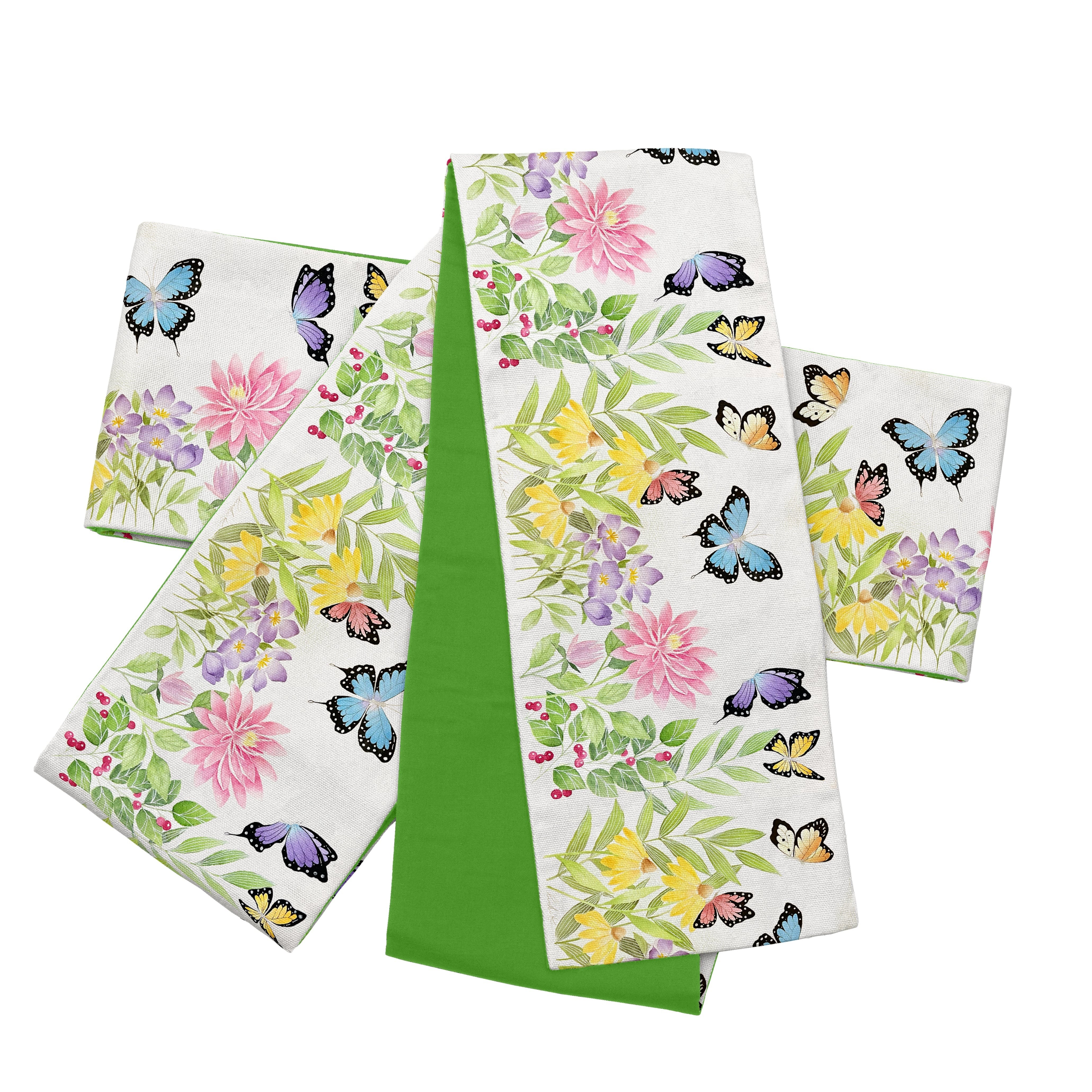 Kimono Bloomオリジナル花帯シリーズ「花畑で遊ぶ蝶たち」半幅帯は、君野倫子の美しい水彩画を基に、可憐な蝶たちが花畑で舞う情景を描いた魅力的なデザインです。